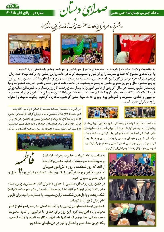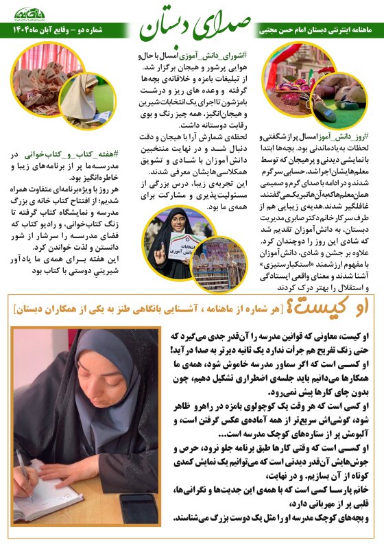 از یکم تا دهم هر ماه، ماهنامهی اینترنتی «صدای دبستان» با نگاهی شیرین، طنزآلود و گاهی احساسی، وقایع شاخص مدرسه رو براتون روایت میکنه؛